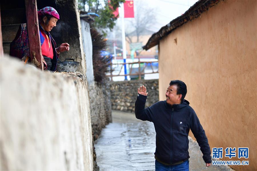 勒阿村驻村第一书记张金利(右)与一位村民打招呼(4月21日摄)。 新华社记者 陈斌 摄