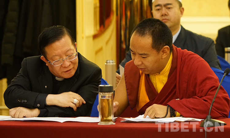 图为2018年全国两会期间,十一世班禅参加小组会时与中国天主教主教团主席马英林讨论 摄影:宋家丽